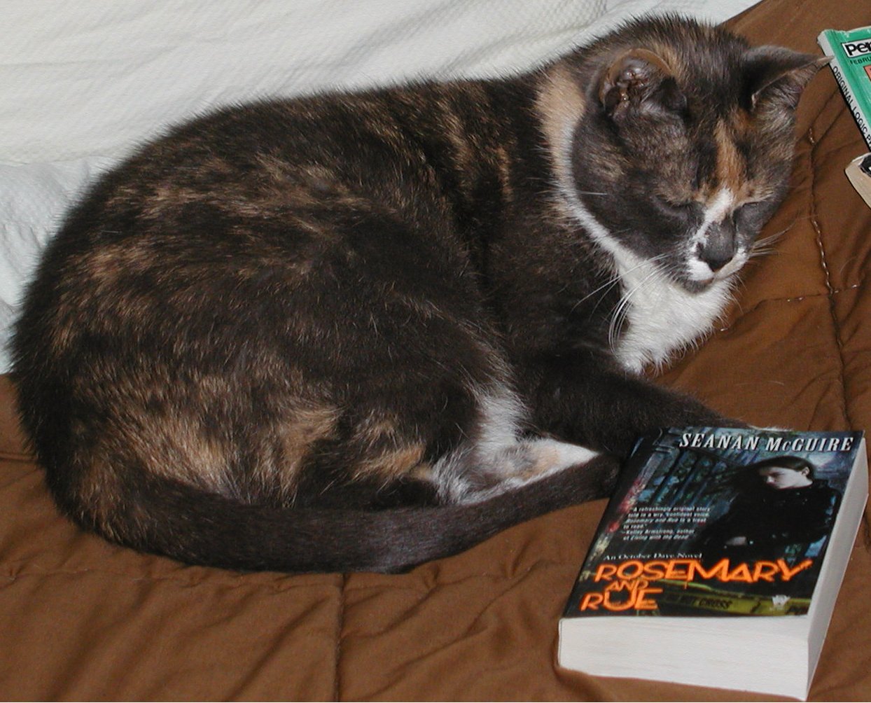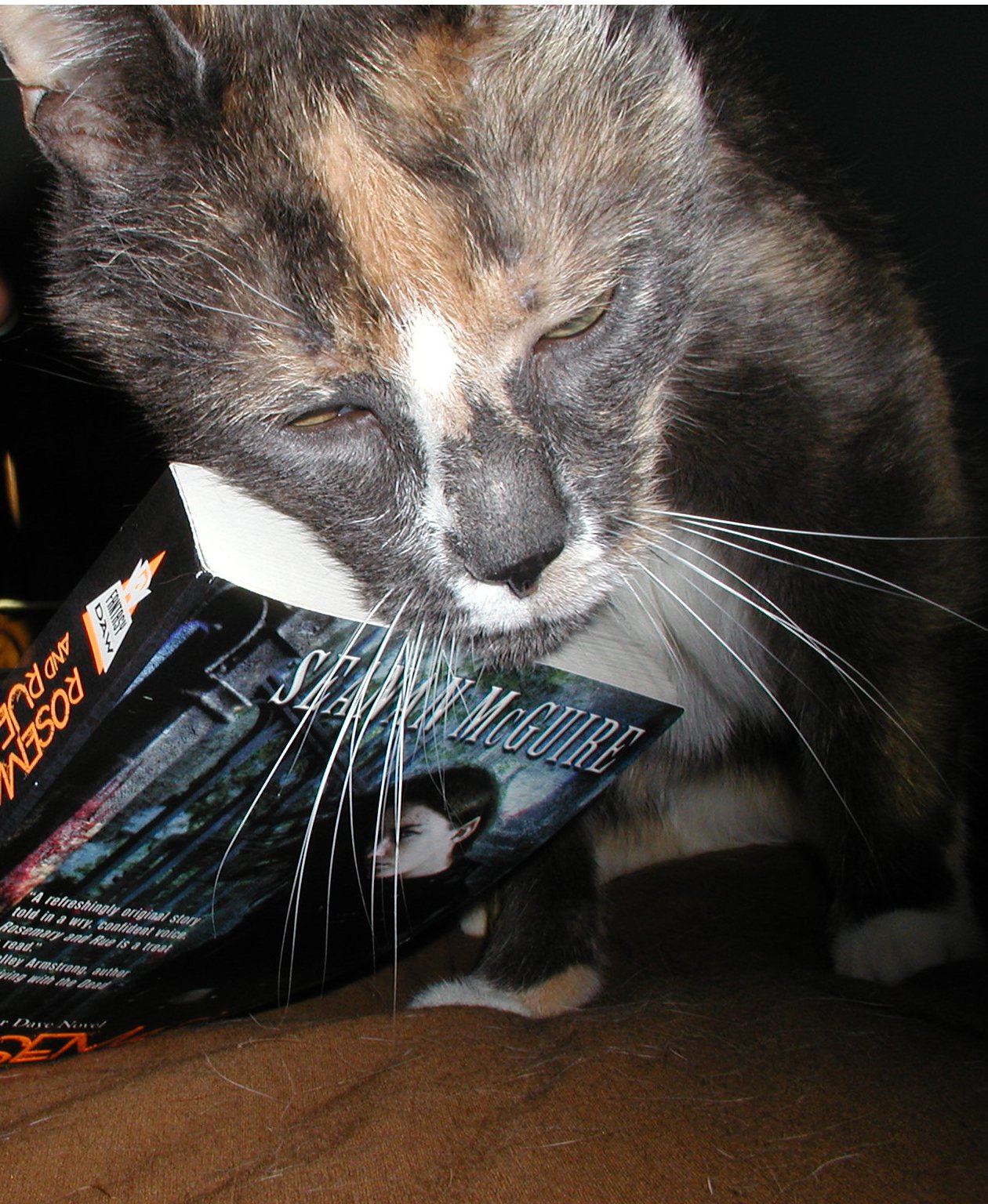 This contest, originally suggested by The Agent, is simple: take pictures of your pets (or the pets of someone else you know) hanging out with a copy of Rosemary and Rue, and submit them here. All pets are eligible. Cats, dogs, pythons, spiny African flower mantises, whatever you have and trust with your book, they're all invited to this party.