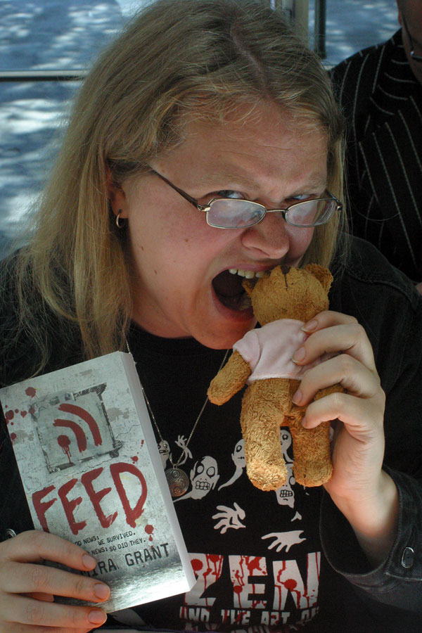 Saturday was my second panel, The Rise of Zombie Fiction, which was a) mad fun, and b) reinforced my desire to write up a handbook for people doing panels at this sort of thing. Priscille from Books for Boobs came to the signing in a perfect Delirium costume, and I tried to eat her plush bear. Amy and I managed to catch the Warehouse 13 panel (Allison Scagliotti for Georgia Mason, anybody?), and then went off to dinner with John Grace at a very nice steak house. They served me port. MY LIFE, SO HARD.